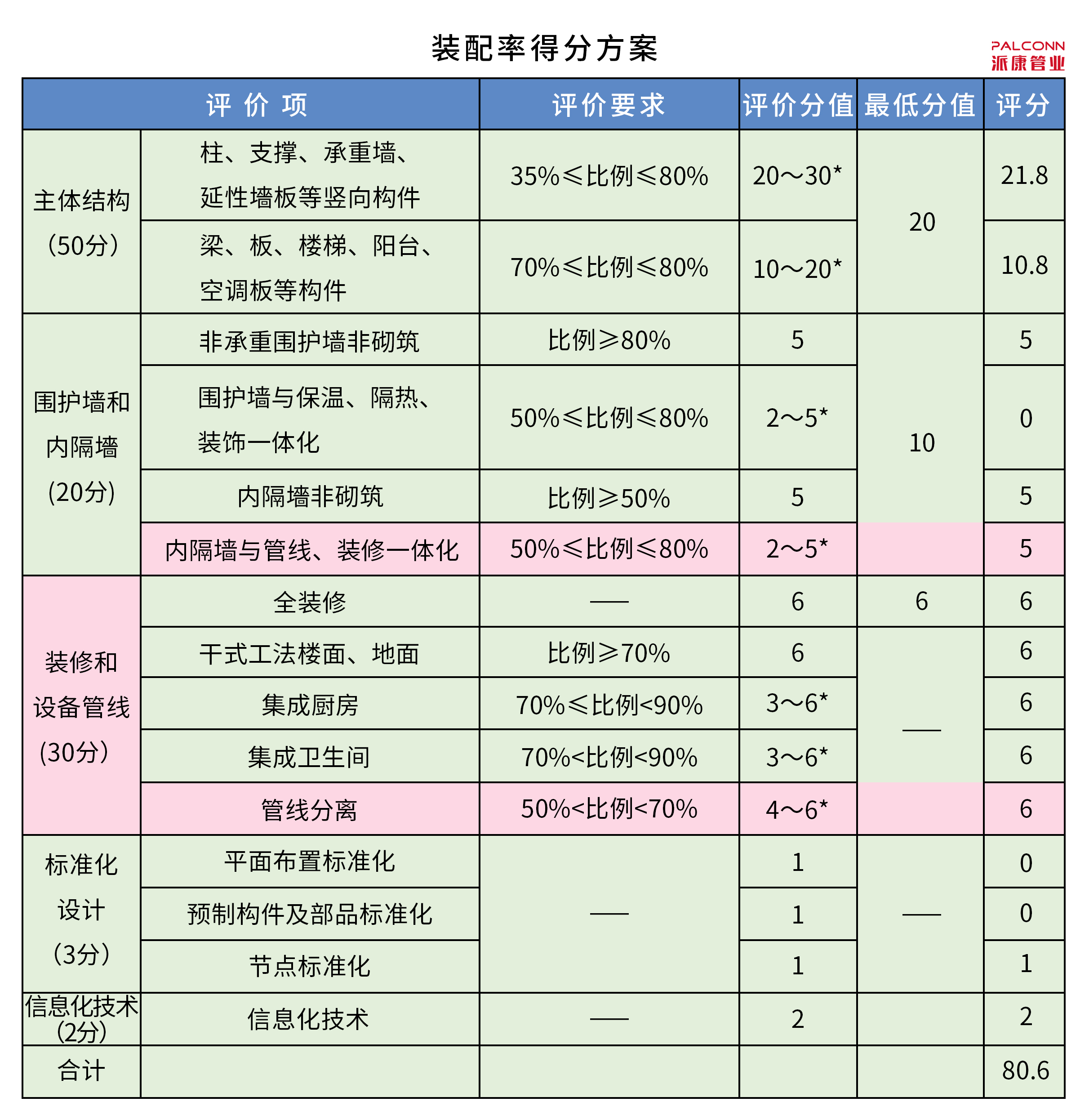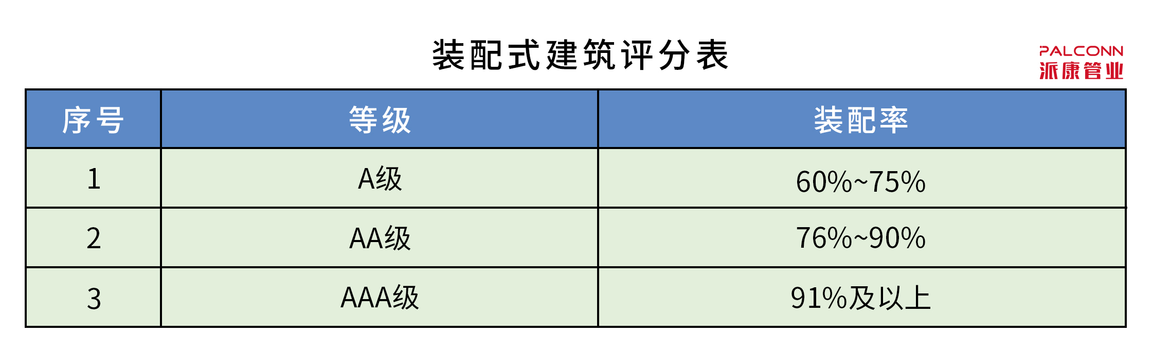 在这个案例中采用派康装配式PB管道系统可以在计算装配率时提高11分。装配率得分80.6评价等级达到AA级标准,能享受当地的更多装配式建筑支持政策。